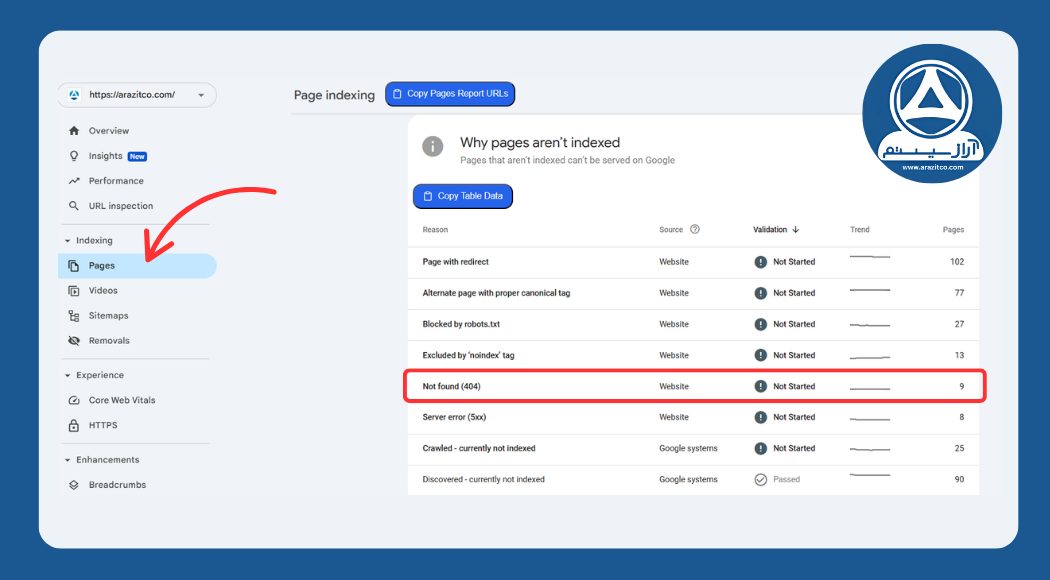 اگر وارد سرچ کنسول سایت خود شوید، در بخش Pages ممکن است با عبارت “Not found (404)” روبهرو شوید. این یعنی گوگل تلاش کرده صفحهای را ایندکس کند اما آن صفحه در دسترس نبوده است. نگران نباشید؛ این مشکل قابل حل است و با چند اقدام ساده میتوانید آن را برطرف کنید.