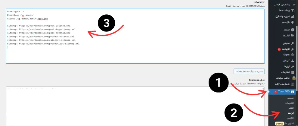 در دستور زیر خرش پنل مدیریت سایت بجز فایل admin-ajax را برای ربات های جستجوگر محدود کرده است و در انتها URL تمامی صفحات سایت مپ رو برای دسترسی راحتتر ربات ها معرفی کرده است. شما می توانید این دستور را کپی کرده و در یک فایل txt. قرار دهید. تنها کافیست بجای بخش yourdomain.com آدرس سایت خود را قرار دهید.